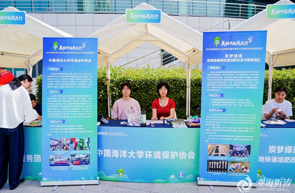 为进一步深化生态理念传播、提升公众参与度,活动现场还设置了一系列展览展区,通过特色展板、绘画创作、志愿者风采展示、生态市集、非遗系列区等系统呈现新时代生态保护成就,开云电竞网址环境科学与工程学院志愿者同学介绍了“榉海偕行”海洋环保知识科普研学和世界环境日、垃圾分类主题宣讲品牌实践项目、“绿色长征”重走习近平总书记生态文明足迹项目和“炭梦绿洲”滨海盐碱地快速培肥改良与碳库增汇项目,展现了海大学子广袤调研筑基,投身美丽中国建设的担当与决心。活动通过沉浸式互动体验提升公众参与度,营造全民共建美丽青岛的浓厚氛围。