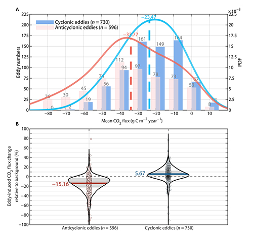 图1. 反气旋涡导致的海洋CO2吸收增强显著大于气旋涡导致的吸收减弱