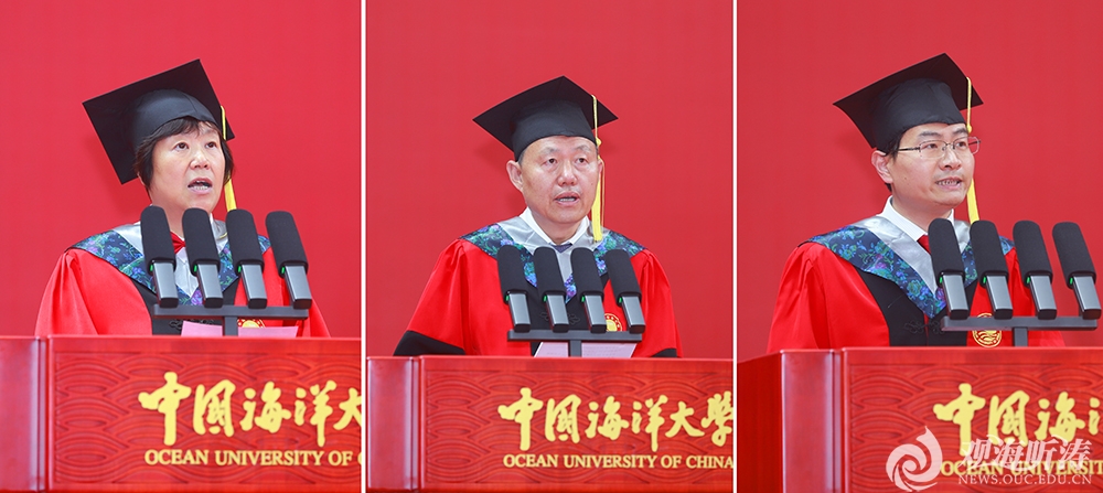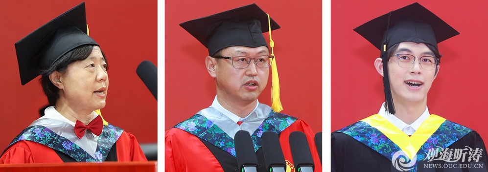 教师代表、信息科学与工程学部部长董军宇教授祝贺同学们圆满完成学业,启程奔赴星辰大海。他以老师与学长的双重身份,希望同学们坚持终身学习,断舍离、勤积累;保持好奇心和想象力,大胆地去发现、去探索。愿再相逢时大家初心仍在、清澈依旧。