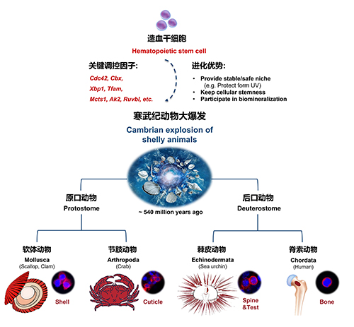 4.骨骼造血跨物种保守性:发现动物界主要类群的矿化骨骼中均存在造血干细胞巢,揭示动物祖先造血干细胞核心调控基因集,骨骼干细胞巢的出现可能是寒武纪动物大爆发的重要驱动力之一。