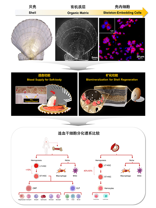 破解该谜题的关键突破口,源于研究团队在一次实验“失误”中取得的意外发现:在用常规软体组织核酸提取方法处理新鲜贝壳的过程中,意外检测到大量具有生物活性的RNA分子,暗示贝壳中存在大量活细胞,并非“无生命的石头”。面对从坚硬、不透明贝壳中研究细胞功能的巨大技术挑战,团队经过多年攻关,成功建立了适用于无脊椎动物外骨骼的干细胞研究体系,并最终通过多组学遗传解析、细胞体外培养和诱导分化、活体动物细胞示踪和功能验证等系统性证据层面揭示了贝壳内存在造血干细胞巢,取得以下原创性发现: