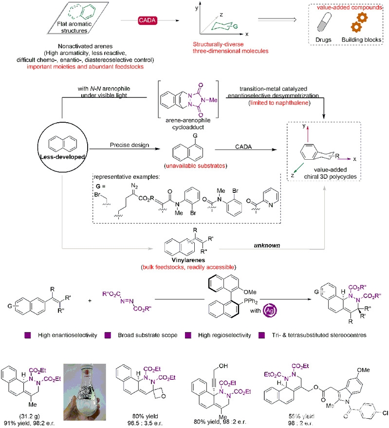 高对映体富集的脂肪族多环骨架结构是众多药物和生物活性天然产物的核心结构单元。这类三维骨架显著增加了分子复杂性,并深刻影响其理化性质、生物活性及毒性特征。然而其合成也面临诸多挑战,如冗长的多步合成路线和对预官能团化底物的需求。在此背景下,稠合芳烃的催化不对称去芳构化反应(CADA)为直接构建高对映体富集、结构多样化的三维骨架提供了一种独特而高效的策略。该策略不仅可用于生成高附加值砌块,还可促进药物候选分子的后期官能团化。过去十几年间,该领域的研究主要集中在具有电子偏向性的芳香化合物(如苯酚、萘酚、萘胺以及吲哚)上,然而萘类化合物因其显著的芳香性,在CADA反应中的应用仍面临巨大挑战。