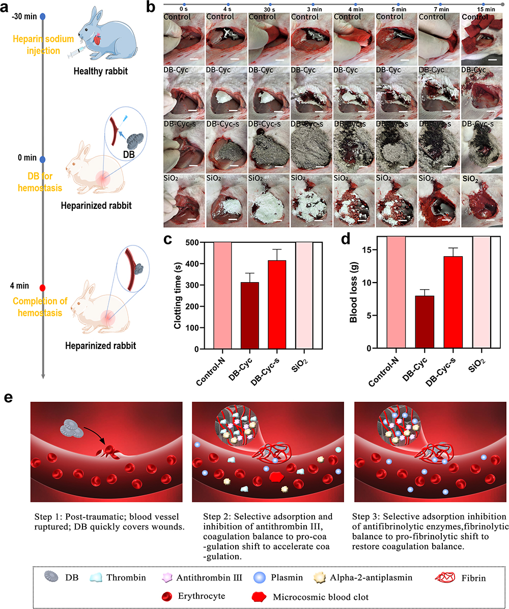 该研究系统揭示了DBs与血液接触后其表面吸附蛋白的演变进程,发现DBs对凝血因子的选择性吸附行为和专一性抑制作用是引发促凝血反应的关键作用机制。基于实验验证和分子模拟结果,发现DBs通过其微纳米层级多孔结构所带来的尺寸筛分效应,实现对抗凝血酶III和α-2抗纤溶酶的高效富集和定向抑制,使血液系统处于高凝状态;其表面硅醇基团可以激活内源性凝血途径相关因子,包括凝血因子V、IX、X、XI和 XII,从而促进凝血反应发生。随后,通过将肝素引入全血中以增强抗凝血酶III活力,证实了DBs的结构界面效应对抗凝血酶III活性的高效抑制作用。最后,建立了血液肝素化的大鼠断尾模型和兔股静脉穿刺模型,从动物水平上进一步评估了DBs在出血性疾病治疗方面的应用潜力。该工作系统的解析了DBs促凝血活性的分子机制,同时也为无机多孔材料的生物活性调控以及新型止血材料的设计提供了新思路。