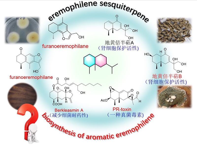 芳构化是天然产物生物合成中一个至关重要的过程,赋予分子独特的化学稳定性和生物活性。在萜类化合物中,芳构化通常涉及复杂的骨架重排,其背后的酶促机制非常独特且鲜有研究。艾里莫酚烷(eremophilanes)是一类结构多样、生物活性显著的重要倍半萜类天然产物,具有良好的药用开发潜力。从生物合成路径来看,所有eremophilanes均起源于马兜铃烯骨架,由法尼基二磷酸(FPP)在马兜铃烯合酶(AS)催化下通过环化反应生成。不同于传统倍半萜类化合物,eremophilanes家族中多个成员含有芳香结构,其形成涉及多异戊二烯骨架的断裂与重排,但具体机制尚未被研究报道(图1)。