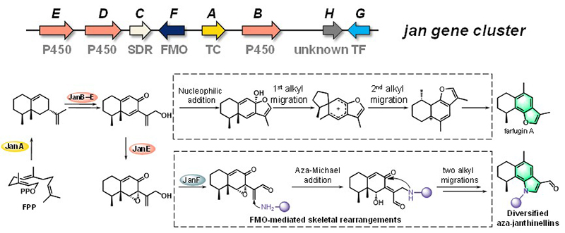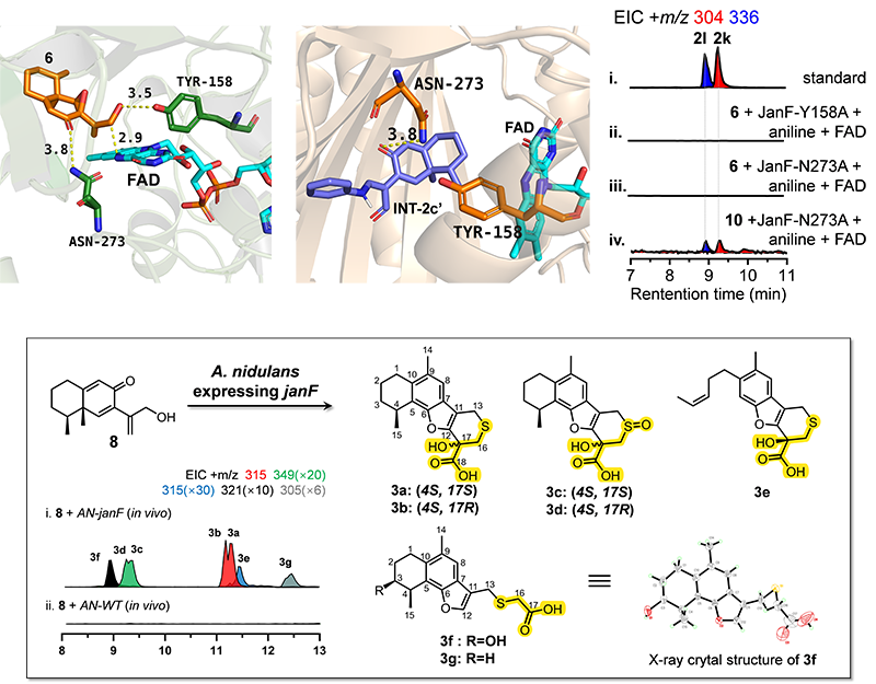 研究团队首先从一株海洋淡紫青霉Penicillium janthinellum H7-4中发掘出一个沉默的倍半萜类生物合成基因簇(jan cluster),并通过在野生菌株中过量表达该基因簇中的途径特异性转录因子JanG,成功激活了该基因簇,获得了具有芳香结构的eremophilanes类倍半萜衍生物farfugin A。为进一步解析其生物合成潜力,研究团队将janA-F功能基因在模式菌株Aspergillus nidulans A1145中逐步异源表达,成功获得了包括farfugin A和一类新颖的由eremophilane骨架与L-苏氨酸杂合而成的芳香倍半萜-氨基酸加合物aza-janthinellin A。后续生物合成机制研究进一步揭示,在farfugin A与aza-janthinellin A的合成过程中均存在由(氧或氮原子)亲核加成引发、并伴随[1,2]-烷基迁移的环重排机制,最终完成芳香化的过程。尤其在aza-janthinellin A形成过程中,一个FAD依赖型单加氧酶JanF被证实能够催化氧化烯丙醇从而生成,具有高反应活性的α,β-不饱和醛中间体,进而接受伯胺类试剂的亲核攻击,以此引发骨架的烷基化迁移和芳香化重排。研究还发现JanF可通过其活性口袋中的Asn273残基稳定C8-羰基,选择性地引导α,β-不饱和酮发生1,2-加成而非1,4-加成,这一过程是构建芳香骨架的关键步骤(图2)。在此基础上利用JanF强大的催化功能,多种伯胺试剂与具有α,β-不饱和醇的eremophilane底物进行孵育,可以获得结构多样、活性良好的一系列氨基酸-eremophilane加合产物。