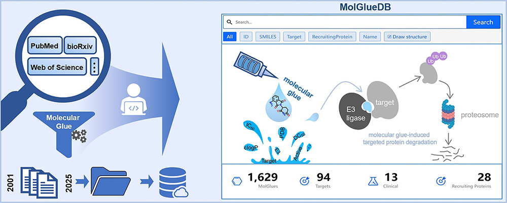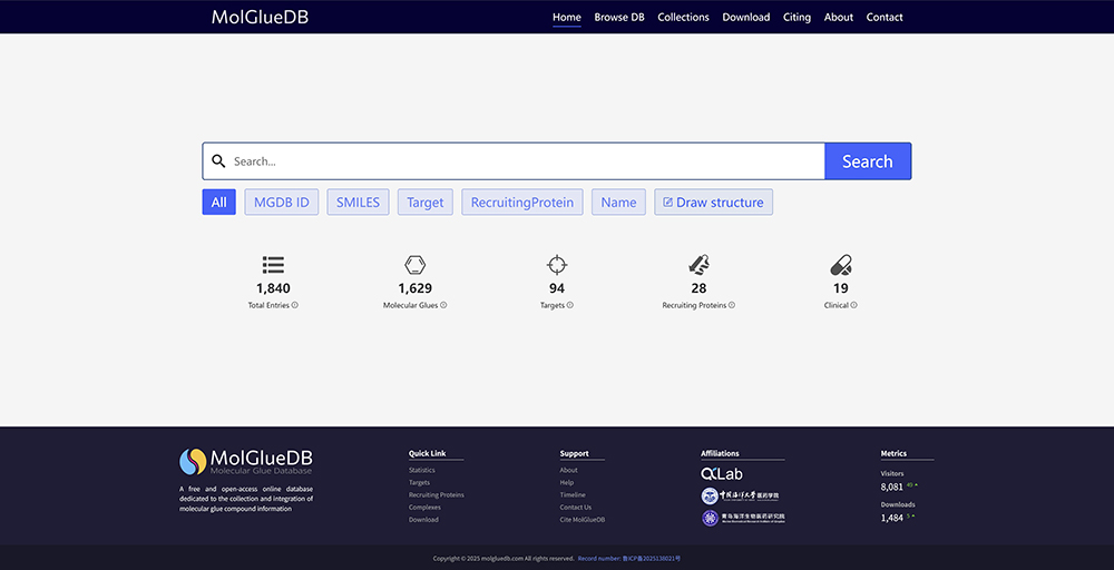 在药物发现领域,分子胶降解剂(Molecular Glue Degraders, MGD)作为一种新兴的靶向蛋白降解技术,正日益受到科研和制药行业的关注。近年来已有20余个分子胶进入临床试验,展现出巨大应用潜力。然而,分子胶降解剂的发现与理性设计面临巨大挑战。为推动MGD的合理设计与开发,研究团队构建并上线了MolGlueDB,这是一个开放访问的网络数据库,旨在为全球研究者提供全面、可靠的MGD资源。该数据库于2025年初正式上线,可通过链接https://www.molgluedb.com/免费访问,访问量已累计超过8000次,数据下载与导出次数达1400余次,充分表明该平台已在学术界和产业界获得积极关注,成为分子胶研究的重要工具。