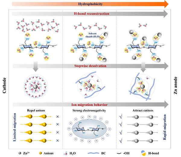 课题组还开发出一种厚度仅18μm的疏水梯度纤维素隔膜。该隔膜借助疏水梯度结构与表面负电荷的协同作用,有效阻隔氯离子渗透并降低界面水活性,不仅为水合锌离子构建了逐步脱溶路径,促进高聚集态电解质的形成以抑制副反应,还通过静电屏蔽效应排斥氯离子、均化锌沉积,进一步提升了电池的循环稳定性。采用该隔膜的锌负极在天然海水电解液中实现了2900小时的长循环寿命,在50%放电深度下稳定运行1300小时,所组装的全电池体积能量密度达233.1 Wh L⁻¹(N/P=2.3)。该隔膜技术为海上储能系统提供了关键材料支撑。相关成果以“Hydrophobicity Gradient in Ultrathin Cellulose Separators for Durable Seawater-Based Zinc Batteries”(超薄疏水梯度纤维素隔膜实现长效海水锌电池)为题发表于《先进功能材料》,该论文的第一作者是材料科学与工程学院2023级博士生董艳莹。