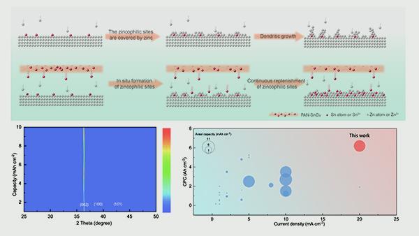 此外,课题组提出了一种动态界面合金化策略,通过可控离子释放实现自适应界面调控。该策略采用氯化亚锡和聚丙烯腈静电纺丝复合界面膜,逐步释放亚锡离子并在负极表面原位还原形成金属锡。后续的锌沉积促使持续形成锌-锡合金,不断补充亲锌位点,诱导Zn(002)面外延生长。该合金化界面还可加速亚锡离子在局部缺陷区域的还原,引导锌优先沉积,修复结构完整性,从而显著提升负极的可逆性与稳定性。基于该策略的电池可实现3.5 mAh cm-2的面容量,稳定循环超过1000次。相关研究以“Dynamic Interfacial Alloying for Highly Reversible Zinc Anodes”(动态界面合金化构筑高可逆锌负极)为题发表于《先进功能材料》,该论文的第一作者是材料科学与工程学院2023级博士生王兴杰。