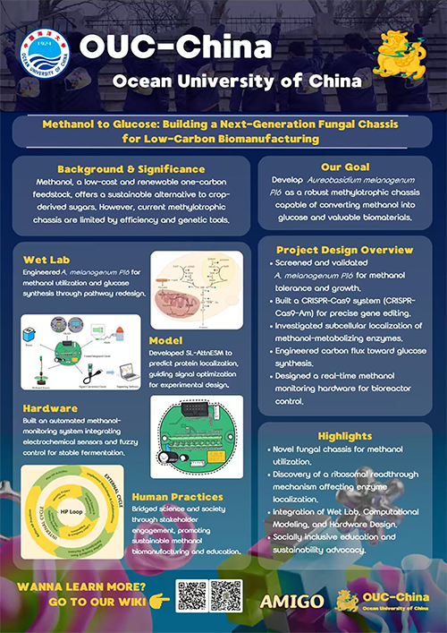 OUC-China团队今年以AMIGO(Aureobasidium Methanol Into Glucose Output)为题,聚焦气候问题背景下的“双碳”问题,重点探索一碳化合物甲醇向高附加值葡萄糖转化的技术突破。项目以多极端耐受海洋酵母Aureobasidium melanogenum为研究对象,建立CRISPR-Cas9基因编辑系统,阐明其甲醇代谢机制,通过重构关键代谢途径,构建出可从甲醇合成葡萄糖的工程菌株。为优化发酵过程,团队基于气液交换模型开发实时甲醇监测与自动进料装置,实现甲醇浓度的便捷精准测量。以上工作为利用该海洋酵母真菌进行一碳化合物生物转化制备化学品奠定基础,彰显其在可持续碳利用中的潜力。