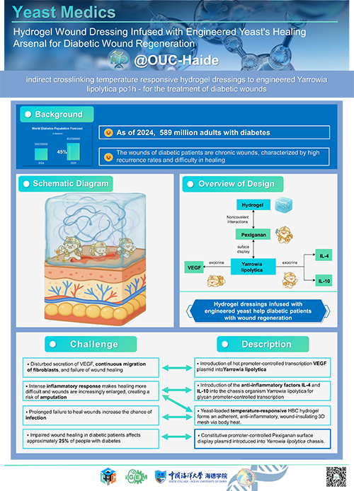OUC-Haide团队今年重点关注糖尿病患者慢性难愈伤口再生的治疗挑战。团队推出“Yeast Medics”项目——一种基于工程化解脂耶氏酵母与L-多巴修饰温敏壳聚糖的创新可注射敷料。该系统可动态感知伤口状态,在酵母表面展示抗菌肽,并程序化释放抗炎因子(IL-4)与促血管生成因子(VEGF),在单一平台上协同解决感染、炎症、再生三大核心难题,为糖尿病患者提供一体化、自驱动、低负担的愈合方案。