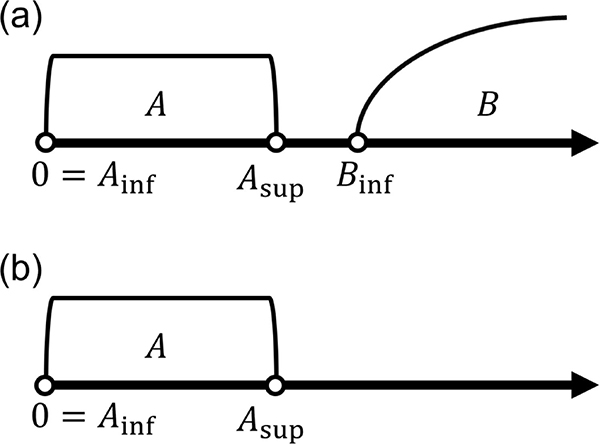 图1: 三个传播波解存在的周期范围的示意图。(a) 区间A和B的并集; (b)单个区间A。其中Asup为A区间的上确界,Binf为B区间的下确界。