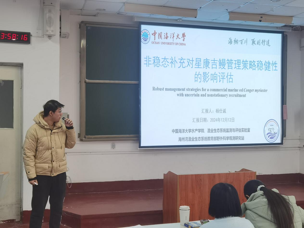 接着,杨仕诚博士作了题为《非稳态补充对星康吉鳗管理策略稳健型的影响评估》的报告。杨仕诚博士介绍了目前渔业管理的挑战以及非稳态补充的环境变异性,并指出了研究的目的与意义,第二部分介绍了研究过程中的数据来源、管理策略评估、操作模型、管理规程及做出的模拟研究,第三部分进行了结果的分析,最后进行了总结。