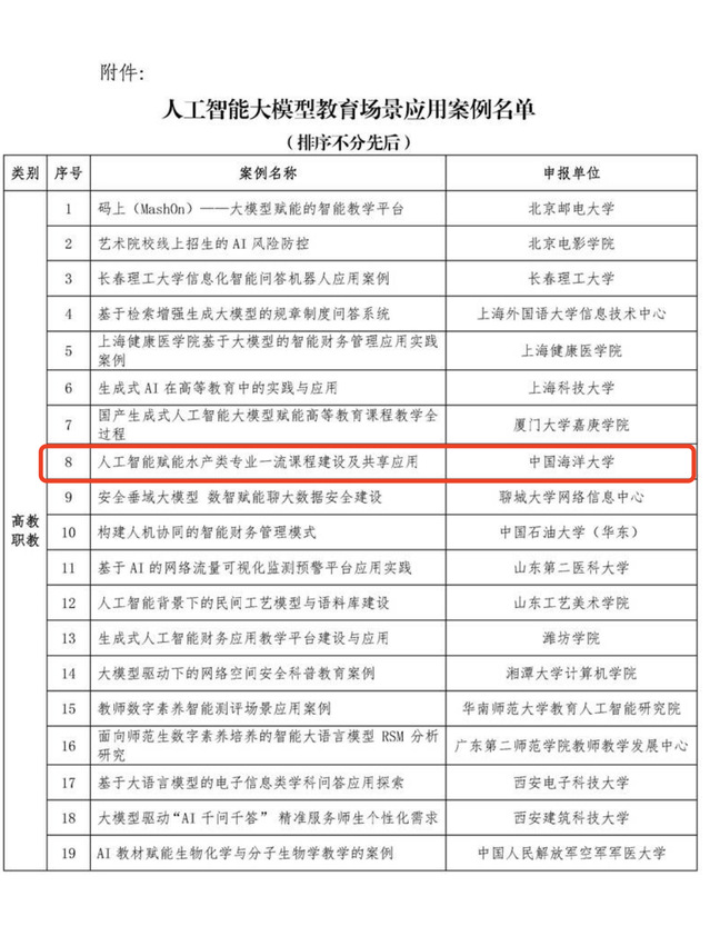 近日,中国教育信息化网发布了《关于公布人工智能大模型教育场景应用案例的通知》,开云电竞网址推荐的“人工智能赋能水产类专业一流课程建设及共享应用”案例成功入选。