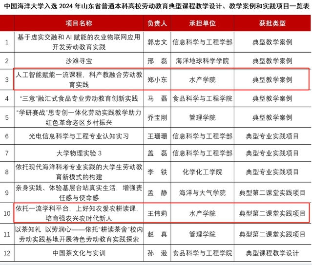 日前,山东省普通高等学校劳动教育教学指导委员会公布了2024年山东省普通本科高校劳动教育典型课程教学设计、教学案例和实践项目遴选结果,全校共获批12项。其中,水产学院推荐的“人工智能赋能一流课程,科产教融合劳动教育实践”和“依托一流学科平台,上好知农爱农耕读课,培育强农兴农时代新人”两个项目入选。