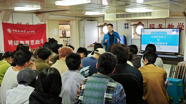 实习期间,各班级、团支部邀请班主任老师共同开展学习习近平总书记五四重要讲话和重要回信精神主题班会、主题团日活动,将专题学习与现场教学深度融合,让思政教育在海上课堂绽放光芒。2022级海洋资源与环境班班主任李建超老师结合参加第41次南极科考的亲身经历,用生动的故事和真实的案例,展现了极地科考的艰辛与伟大,鼓励同学们坚定自己的专业志向,将个人的青春奋斗勇敢地融入到国家海洋事业的发展浪潮中。在辽阔的大海之上,同学们重温入团誓词、分享学习体会,深刻体会“胸怀蓝色梦想、堪当时代重任”的使命感责任感。