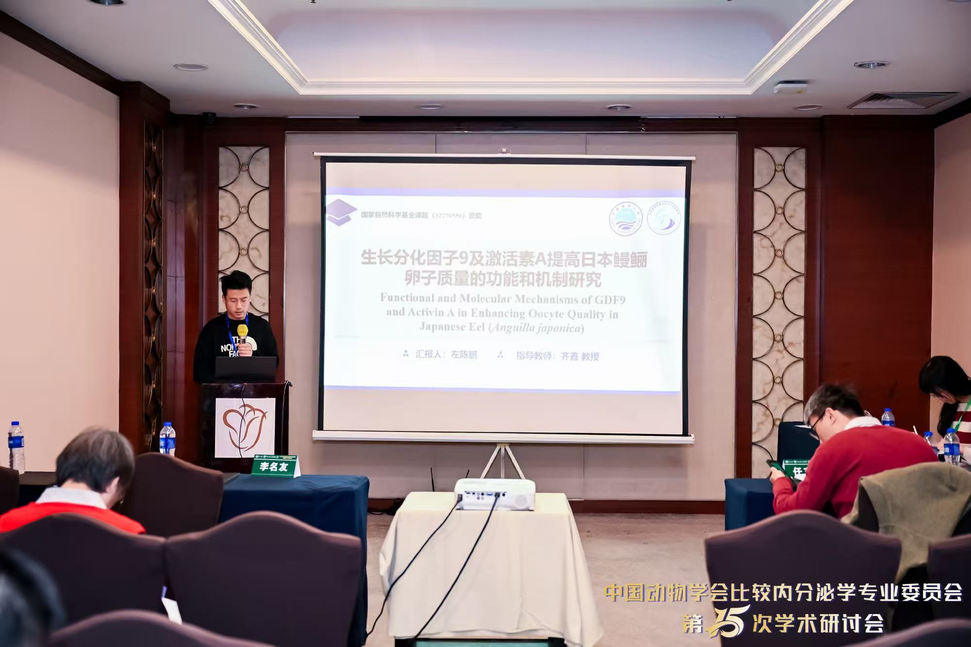 温海深教授与参会专家亲切交流 30日上午,温海深主持第二场专题报告,并与专家进行交流。30日下午,大会设置研究生学术报告专场,实验室3位研究生作口头报告,展示了课题组在鱼类内分泌与生殖调控方面的最新进展。其中,博士生左陈鹏作题为《生长分化因子9和激活素A提高日本鳗鲡卵子质量的功能及机制研究》的报告;博士生杨晶汇报了《RNAi介导的肌抑素敲低可改善花鲈肌肉质量》的研究成果;硕士生杨欣琳则以《卵胎生硬骨鱼许氏平鲉妊娠维持机制解析》为题介绍了相关工作。三位同学报告内容充实、思路清晰,展现了实验室青年学者良好的科研素养。