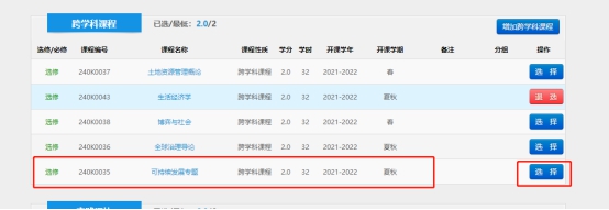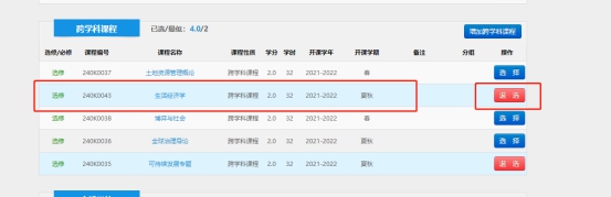 在“专业课”中选择《宪法与行政法学》,在“跨学科课程”中选择《可持续发展专题》、退选《生活中的经济学》。(选择好后务必点击“提交”)