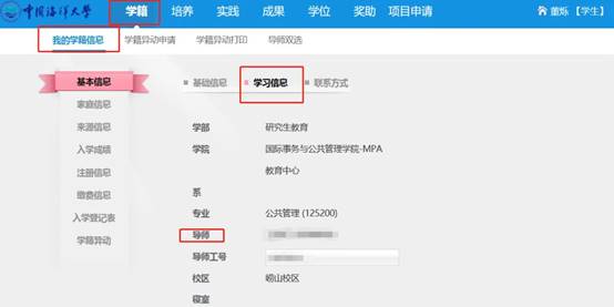 导师接收后,可以登录我的学籍-学习信息再次确认导师,如图: