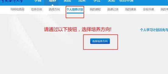 1、登录研究生系统(2018级)以后,点击“培养”-“选择方向”或直接点击主页面“制定计划”(2022级培养方案分地方政府治理、海洋资源与环境管理、公共安全与风险治理、公共政策4个方向,一般以导师的研究方向为准,请询问导师后选择一个保存)