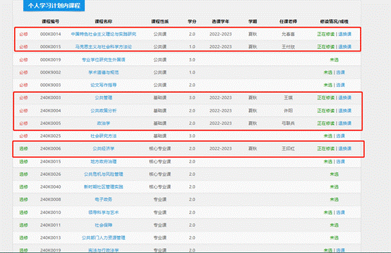 本学期选择《中国特色社会主义理论与实践研究》(选择允春喜或国晓光老师-国管学院MPA教育中心开课)、《马克思主义与社会科学方法论》(选择王付欣老师)、《公共管理》、《公共政策分析》、《政治学》、《公共经济学》6门课程。