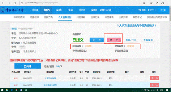至此,培养计划制定完毕,先在页面最上方选择“提交”,显示未审核状态。至此,个人培养计划制定完成。请等待导师及中心审核,审核完成后,中心会发通知再进行选课(按照通知,8月1日后进行选课工作)。