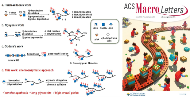 糖胺聚糖(GAGs)是一类线性多糖,由硫酸化的二糖重复单元组成,参与多种生命过程。乙酰肝素酶是一种内源性β-D-葡萄糖醛酸苷酶,在人类肿瘤细胞和特定组织(例如哺乳动物的胎盘)中高水平表达。乙酰肝素酶与多种生长因子的激活有关,这些因子在导致组织修复、细胞粘附、生长、增殖和分化、癌症血管生成和炎症等相关疾病中发挥着重要作用。最近,我们课题组通过正交脱保护化学合成了区域选择性硫酸化的半乳糖胺衍生物,并基于开环易位聚合(ROMP)和后修饰策略生成了系列糖聚合物。具有多种硫酸化模式的半乳糖胺聚合物显示出对乙酰肝素酶的显着抑制作用,其中含有3,4,6-O-硫酸化的GalNAc的糖聚合物能够有效抑制乙酰肝素酶活性以及肿瘤细胞的增殖。在此基础上,具有肿瘤靶向作用的iRGD肽通过末端功能修饰引入。流式细胞术和共聚焦显微镜结果显示,末端功能化的糖聚合物,可以有效进入HeLa细胞并抑制参与肿瘤细胞增殖的信号通路。这些发现有利于推动针对特定肿瘤靶向疗法的新型糖模拟物药物开发。