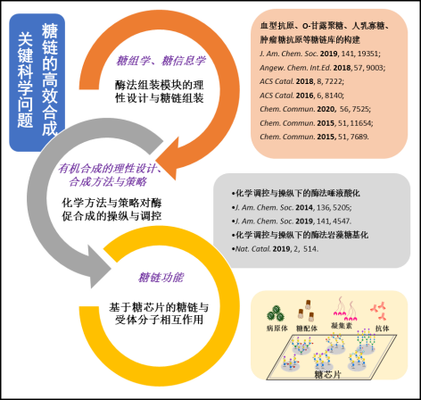 糖组学是继基因组学与蛋白质组学后又一个生命科学前沿, 而糖链的高效合成是影响糖组学, 乃至整个糖科学发展的关键制约因素。本课题组的研究兴趣聚焦于糖链高效合成这一糖科学研究领域的关键科学问题与技术瓶颈。充分发挥有机合成与生物催化等多学科交叉优势, 围绕“组学导向的功能糖链系统性合成”,创新性的将有机合成的理性设计理念、合成方法和策略与酶促合成有机融合, 实现了对酶促反应的调控和操纵, 发展了糖链酶法合成的重编程策略、底物工程策略和模块化组装策略, 实现了200多种复杂功能糖链的系统性精准合成, 为糖链功能研究与糖药物开发奠定了基础。