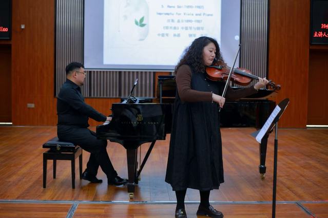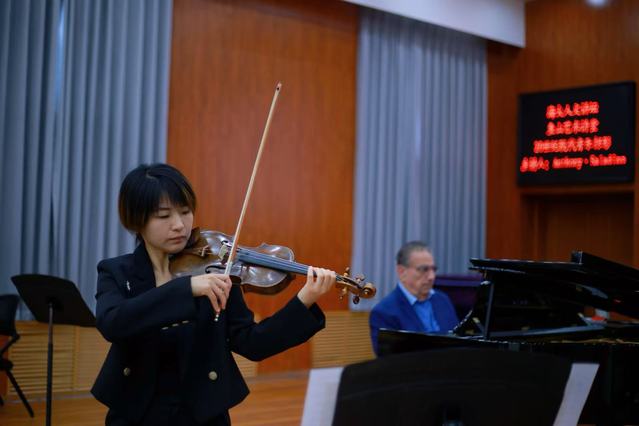 此外,他还演奏了自己改编自巴托克、巴伯的作品《一首小提琴奏鸣曲》以及贾巍副教授创作的《社火组曲》第五首《织手巾》,进一步展示了独特的作曲风格。
