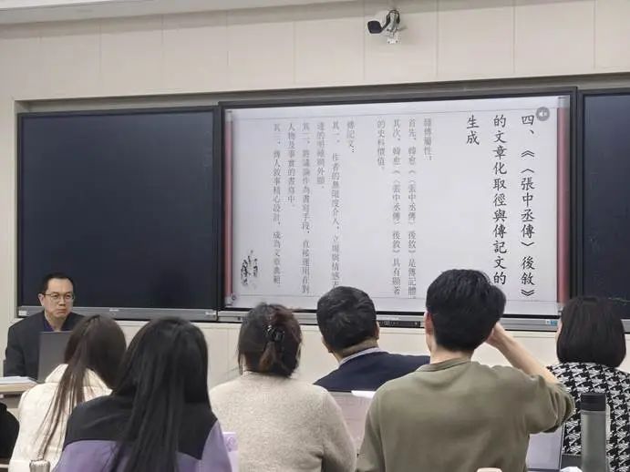 首先,熊明教授在讲座中围绕张巡其人、张巡守城事件等六个方面详细介绍了张巡守城这一历史事件以及《张巡中丞传》的撰写背景。在此基础上,熊明教授将《张巡中丞传》的书写策略及其品格归纳出三个特点:一是持论一破一立,立场鲜明;二是叙事尚真实、尚详密;三是显扬张巡的“忠”与“功”。其次,熊明教授通过对《<张中丞传>后叙》创作背景的详细分析,指出韩愈在传中表达了反对藩镇割据、支持中央集权的态度,旨在为宪宗平藩、削藩提供舆论支持。在此基础上,熊明教授总结认为《<张中丞传>后叙》兼具杂传属性与传记文特征,呈现由史体而文体的显著特征。最后,熊明教授通过对韩愈柳宗元的传记体文体实践进行列举与分析,总结了传记体从史体到文体的拓展及其意义。