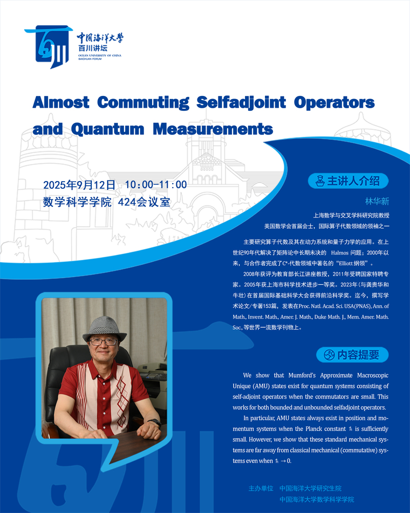 研究生百川讲坛第517讲-林华新:Almost Commuting Selfadjoint Operators and Quantum Measurements