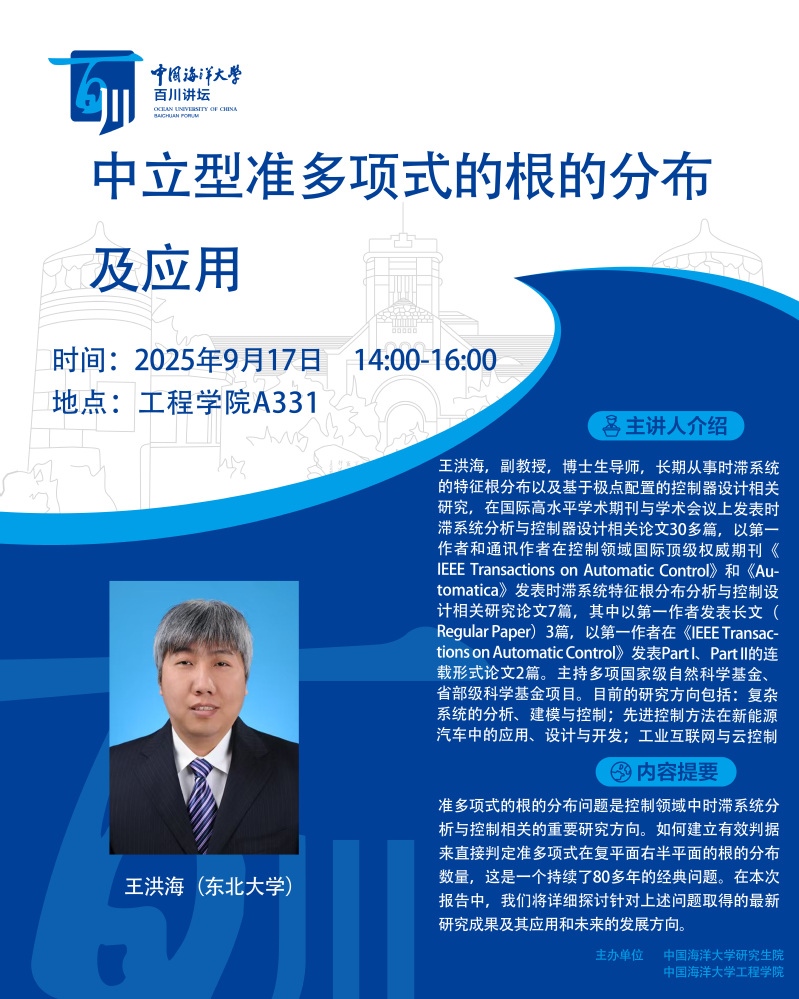 研究生百川讲坛第519讲-王洪海:中立型准多项式的根的分布及应用
