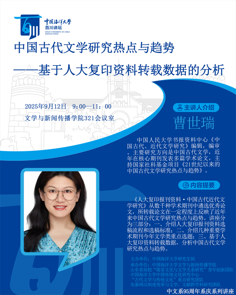 研究生百川讲坛第516讲-曹世瑞:中国古代文学研究热点与趋势——基于人大复印资料转载数据的分析