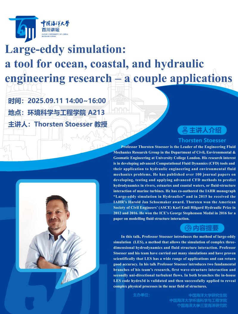 研究生百川讲坛第515讲-Thorsten Stoesser:大涡模拟:海洋、海岸与水利工程研究的利器——若干应用实例