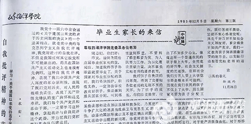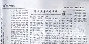 刊登作者父亲来信的校报“关于国家对毕业生分配的原则,我们坚决拥护,积极支持,一定协助学校教育好孩子,