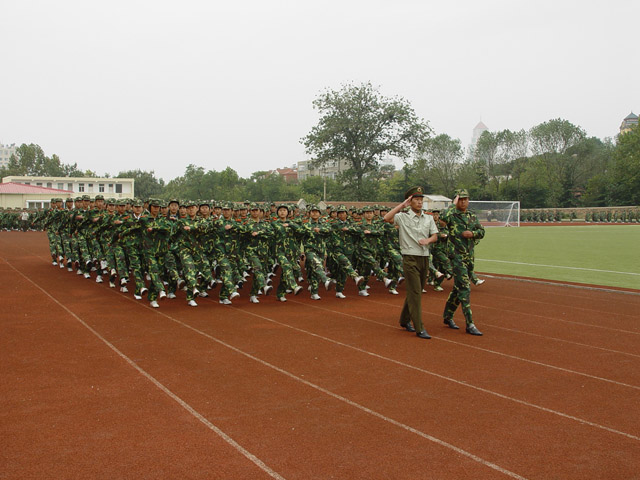 本站讯 2004年9月18日8时20分,2004级新生军训阅兵仪式在鱼山校区运动场进行彩排,共有2